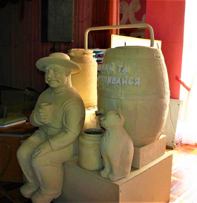 Двометрова скульптурна композиція зображує вусатого українця з чаркою, за спиною якого булькає самогонний апарат, а поруч із бідоном, куди з апарату стікає вогненна вода, сидить кіт.