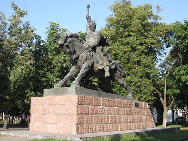 Бронзовий кінний пам'ятник роботи скульптора Валентина Борисенка та архітектора Миколи Копила встановлено у 1993 році навпроти філармонії, поряд із будівлею Хмельницької обласної адміністрації.