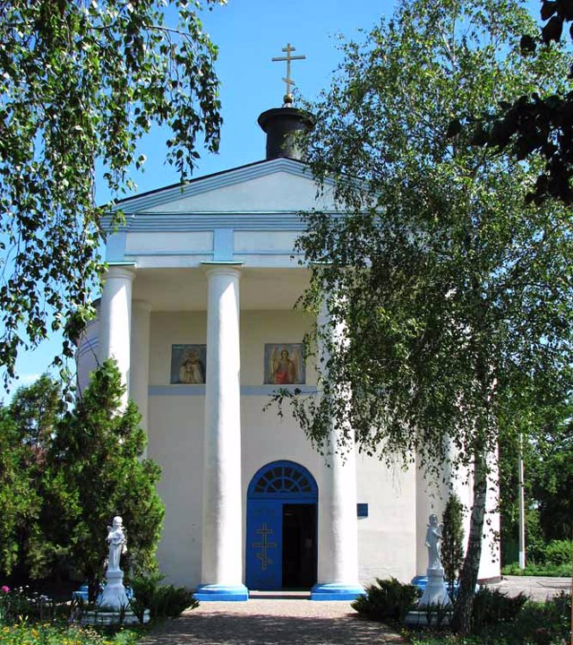 Велика кам'яна споруда виконана в стилі класицизму. В плані храм круглий, із двома виступаючими з боку паперті та вівтаря портиками. Вінчає його купол на барабані з прорізаними у ньому вікнами. В 1827 році була зведена граціозна двоярусна кам'яна дзвіниця. Перший її ярус оточували колони, другий прикрашали пласкі пілястри. На жаль, дзвіницю було знищено за радянських часів, коли храм було закрито.