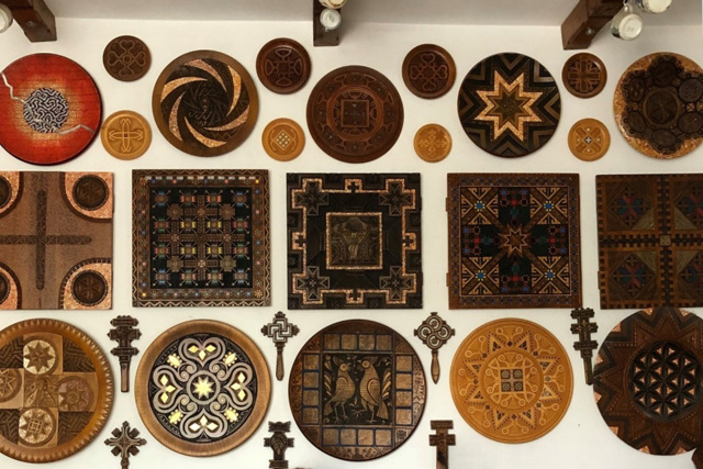 В експозиції представлено понад сто власних робіт майстра. Серед них орнаментальні ікони, тарілки, картини, копії гуцульських ручних хрестів, традиційні зґарди та суч ...