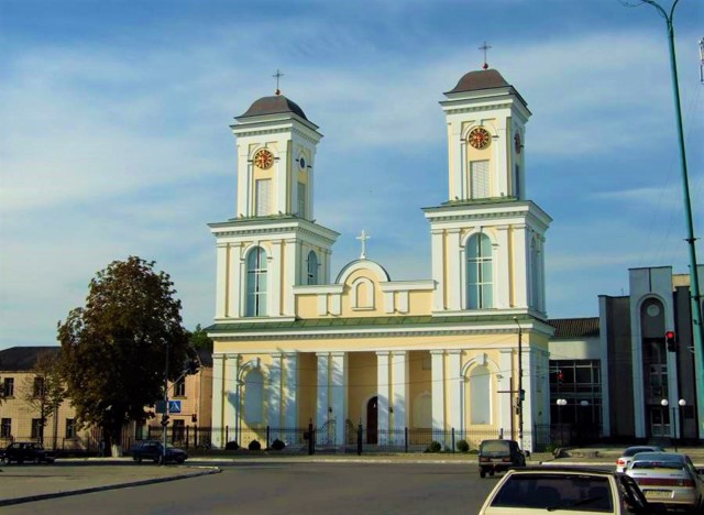 В 1805 році, після того, як згорів дерев'яний храм, костел був заново відбудований у камені коштом графа Станіслава Потоцького. Дві його величезні симетричні башти на фасаді домінували над міською забудовою.