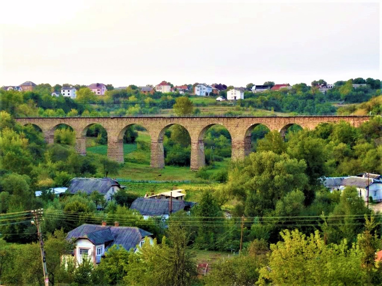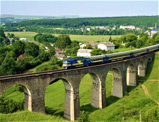 The nine-arch stone railway bridge was built in 1896 during the construction of the Ternopil - Kopychyntsi railway.