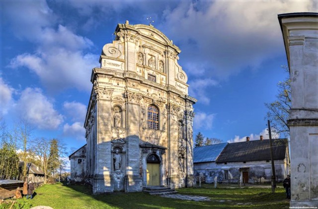 The facade is decorated with numerous sculptures of saints and complex white stone carvings (it is assumed that the master who designed the facade of the Jesuit church in Lviv participated in the construction).