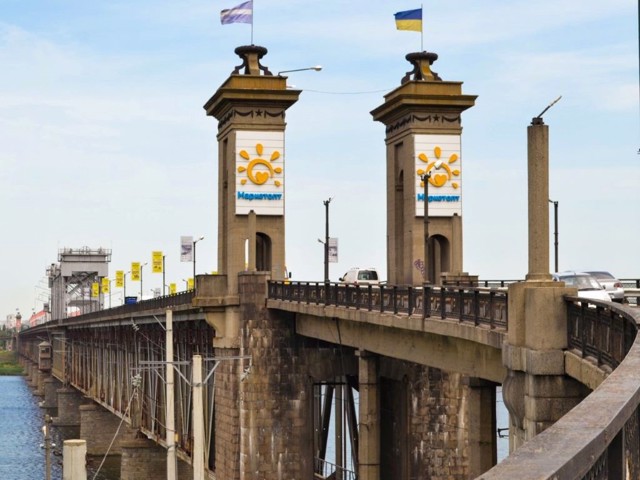 The city of Kremenchuk is located on both banks of the Dnipro connected by a two-story road and railway bridge (1872-1949).