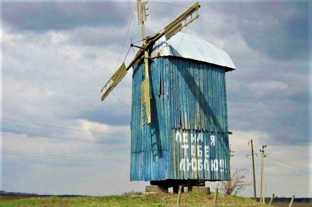 На в'їзді в село стоїть дерев'яний вітряк.