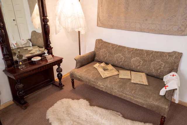 A tea party is held for museum visitors on the veranda.