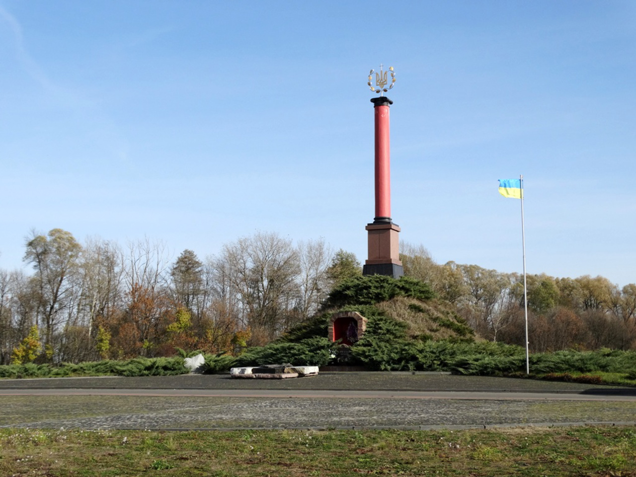 The central element of the Kruty Heroes Memorial is a monumental stele in the form of a column of the Red Corps of Kyiv University, crowned with a trident.