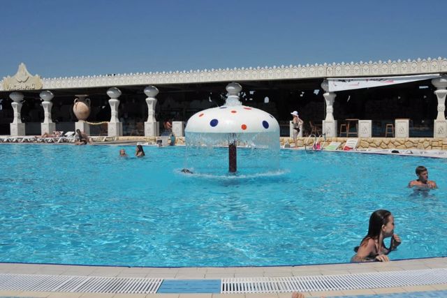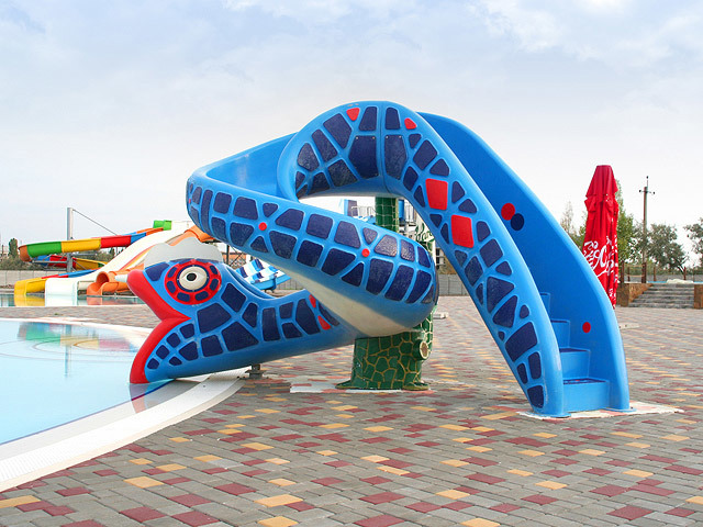 Main pool area of 4000 square meters with hydromassage, swimming pools and children's pool. 10 slides for adults: "Family rafting", "Kamikaze", "Multi-slide", "Flying boat", "Serpentine", "Black hole", "Kosychka", "Wide slide", "Space gap". There are also 9 children's slides.
