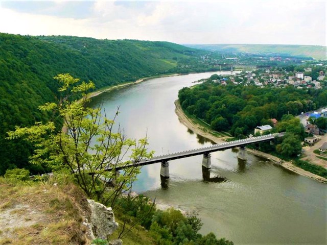 Звідси добре проглядається автомобільний міст над Дністром та куполи Хрещатицького монастиря.