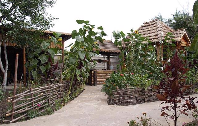 Made in an ethnic style: a Ukrainian mud house with a reed roof, a village yard fenced with mud, a wooden carved well in the yard. On the territory, you can visit an authentic Ukrainian house-museum, which recreates the lifestyle of the Ukrainian peasantry of the 18th-19th centuries. A unique collection of household items and decorative and applied art, collected by the founder of the complex, Pavlo Zektser, is on display.