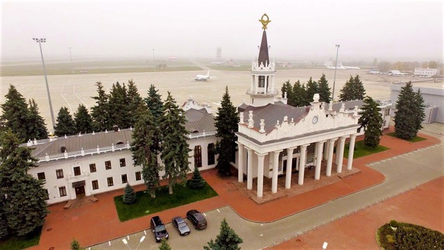 The existing airport terminal was built in the post-war years according to a typical project developed by the Moscow Research Institute "Aeroproject" in 1951 (architects Elkin, Kryukov, Mitkevych). This project was applied in Lviv, Sverdlovsk (now Yekaterinburg), Chelyabinsk and other cities of the USSR. The construction of the airport began in 1951, and its opening was dedicated to the pompous celebration of the 300th anniversary of the reunification of Ukraine with Russia. From the outside, the building of the air terminal is distinguished by the increased grandeur characteristic of the "Stalinist" architecture of the 30s - 50s. The central entrance is decorated with an eight-column portico with a high parapet of a complex outline. An elegant octagonal turret with a slender tent and a spire topped with a gilded wreath rises above the building. The interiors are richly equipped with stucco architectural details and paintings.