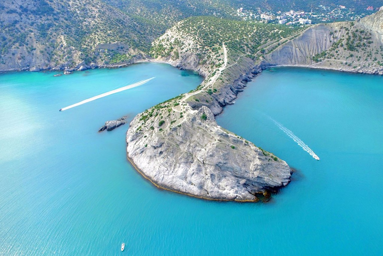 Cape Kapchyk is the most memorable element of the Novyi Svit landscape. Behind it, the pointed peak of Mount Khoba-Kaya, separated from Kapchyk by the Blue Bay, can be seen.