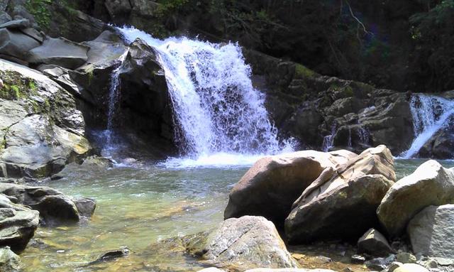 Вода з висоти 7 метрів падає з масивних кам'яних валунів у мальовничому проломі у гірському хребті двома потоками, розділеними скельним виступом.