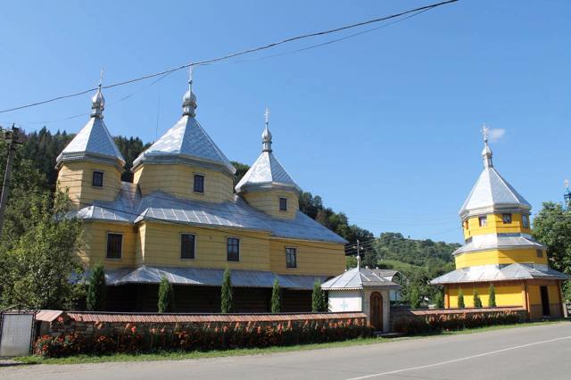 Церква пофарбована у жовтий колір, бані покриті бляхою.