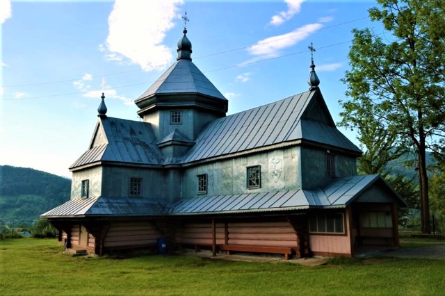 Made in Hutsul style. It is cruciform in plan with a large central square log that supports a tent-shaped roof with a pear-shaped crown.