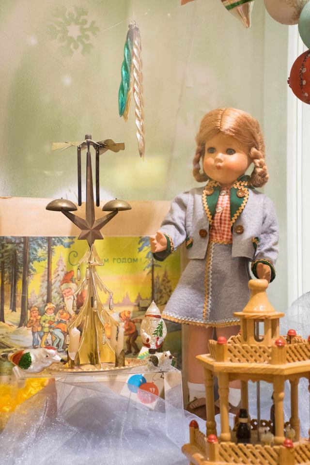 Представлені іграшки різних років: ляльки-міліціонери 30-х років, перші трансформери 30-х років, целулоїдні фігурки 40-х років, ретроведмежата 50-х років, неваляшки 60-х років, заводні тварини 60-х років.