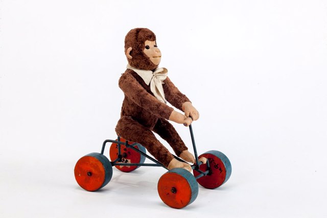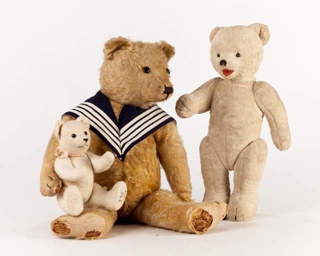 Toys from different years are presented: policeman dolls from the 30s, the first transformers from the 30s, celluloid figures from the 40s, retro teddy bears from the 50s, stuffed animals from the 60s, clockwork animals from the 60s.