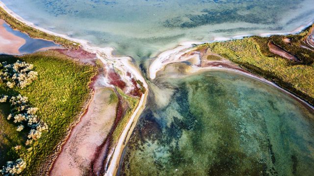 Kinburn has about 150 lakes, some with healing mud. About 50 species of animals live on the peninsula: raccoon dog, spotted deer, fox, beaver. Large turtles live with a shell diameter of 40 centimeters.