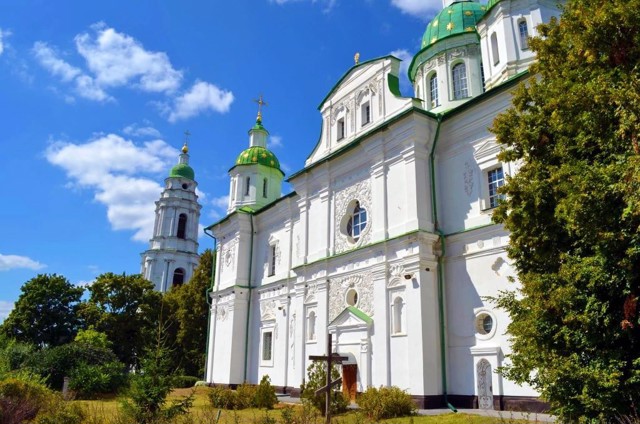 In 1684-1692, on the site of the first wooden church, at the expense of hetmans Ivan Samoylovych and Ivan Mazepa, the stone Savior-Transfiguration Cathedral was built (architect Johann-Baptist Sauer).