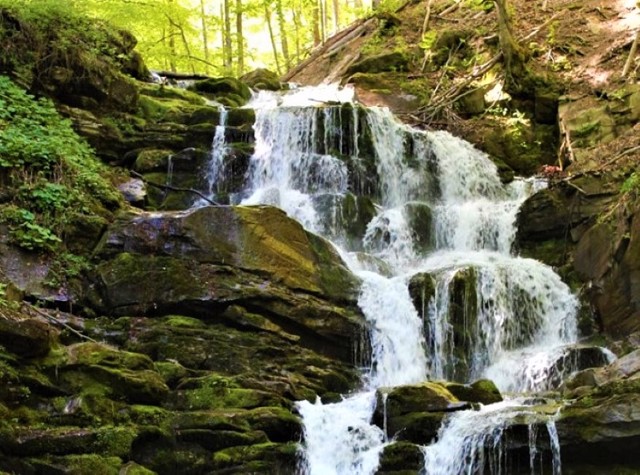 The lower waterfall of the cascade is located within the village, 400 meters from the track. To the largest and most beautiful waterfall Velykiy Huk (18 meters) you need to walk 2.5 kilometers through a gorge along the stream. On the approach to the Velykiy Huk, you will see the waterfalls Kovber (3.5 meters), Sych (10.5 meters), Nizhniy Huk (9 meters), Vorota (3.5 meters) and Seredniy Huk (10.5 meters).