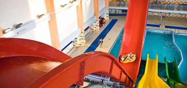 On an area of 14,000 square meters, there is a 50-meter sports pool, an entertainment area with 9 water slides of different lengths and levels of difficulty, a children's area with a small pool and small slides.