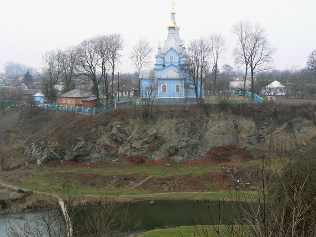 The Church of Saints Cosmas and Damian in Novyi Korets stands on a coastal rock above the Korchyk River directly opposite the Korets Castle.
