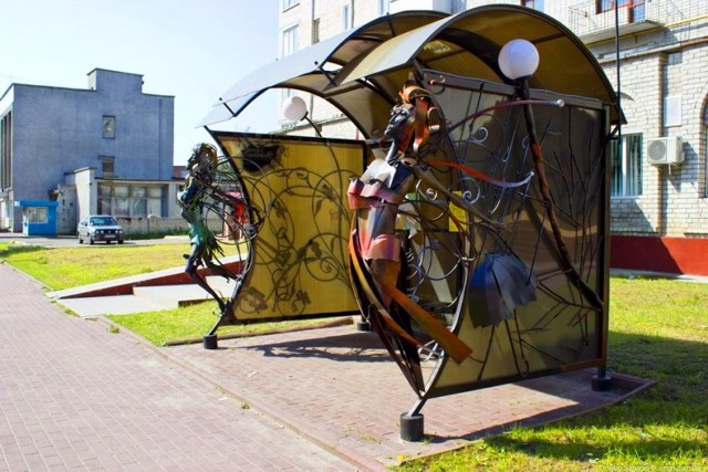 A creative bus stop forged from iron was installed in Slavuta in 2012 for Spring Day. The author of the work is Artem Volsky.