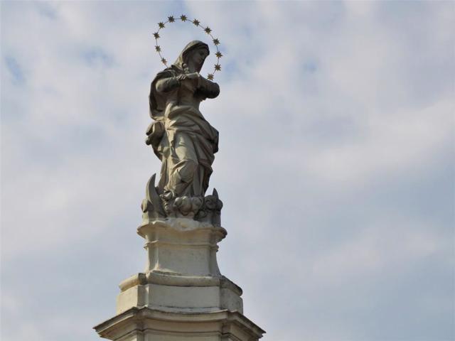 The roadside figure of the Mother of God was installed in Buchach in 1751 by order of the owner of the town, Mykola Potoski. It was one of the early works of the outstanding sculptor Ivan Heorhiy Pinzel and the architect Bernard Meretyn. The coat of arms of the Potocki family "Pilyava" is depicted on the pedestal.