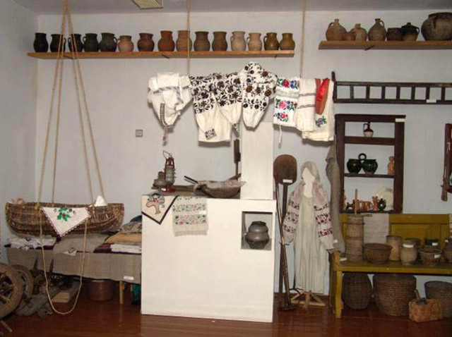 In the center of the exposition is a panorama of the village with picturesque landscapes. The interior of a traditional Ukrainian home has been recreated: a stove, benches, a table, a chest, a icons, a cradle, a shrine, shelves, basins with dishes, towels, samples of Ukrainian national clothing.