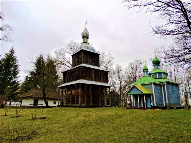Неподалік розташований ще один дерев'яний храм – Покровська церква (1778 рік) з селища Сухий Яр. За радянських часів у ньому розміщувався музей атеїзму, а зараз це музей Української православної церкви.