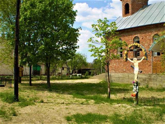 Руины костела Святого Иоанна Крестителя находятся в поле слево от трассы на въезде в село Мужиево со стороны Берегово.