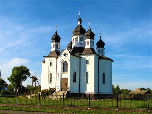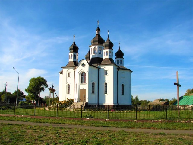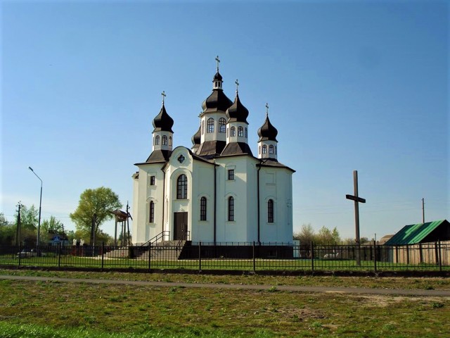 Каменный пятикупольный храм был отстроен в 1789 году в стиле украинского барокко. Рядом находилось здание церковно-приходской школы.
