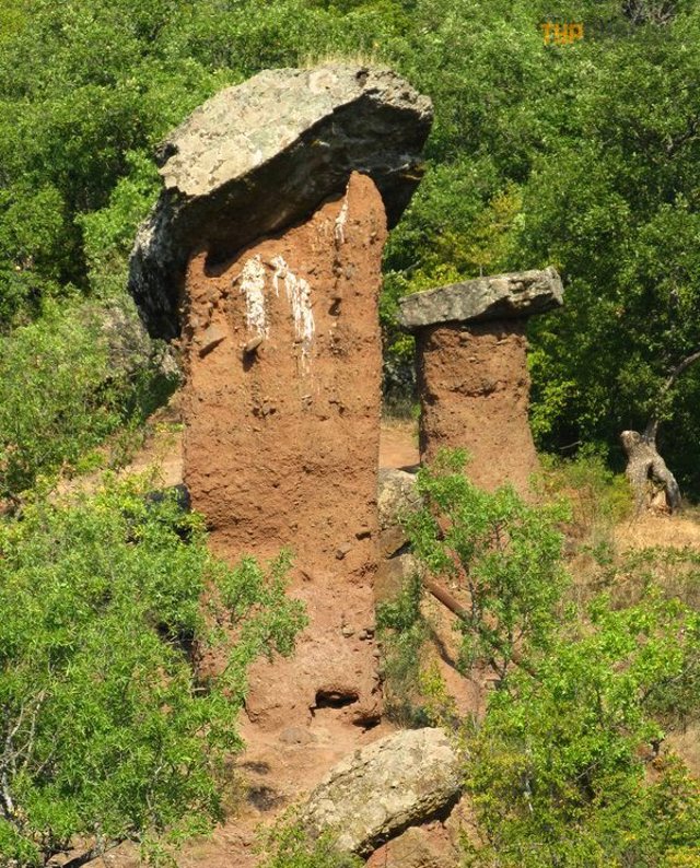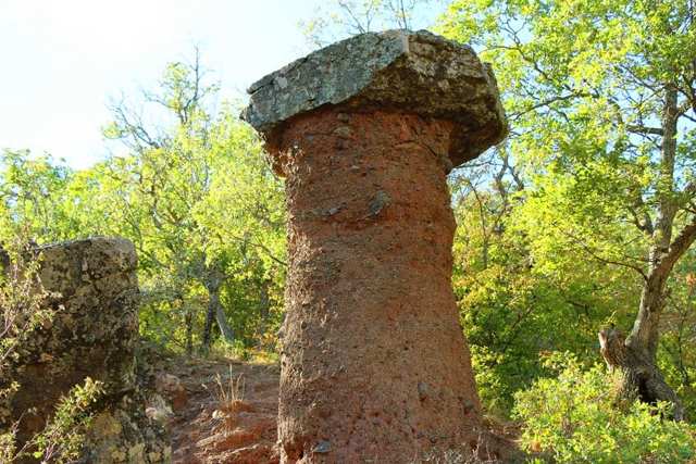 Здесь в процессе выветривания и водной эрозии образовались удивительные каменные грибы высотой до 7 метров. Шляпки "грибов" образованы плотными плитами конгломерата, а "ножки" - более рыхлыми отложениями, которые быстрее "шляпок" подвергались разрушению, в основном, водой, стекающей со склонов. Есть большие грибы с диаметром "шляпок" до 2 метров, и грибочки поменьше - около 1 метра высотой. Со временем грибы разрушаются под действием эрозии, но при этом появляются новые.