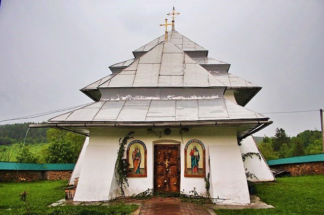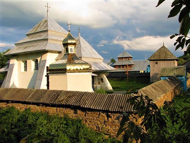 Тридольний храм, триверхий. Раніше мав гонтове покриття ступінчастого даху, але зараз покритий жерстю. Товщина стін досягає 1,5 метрів.