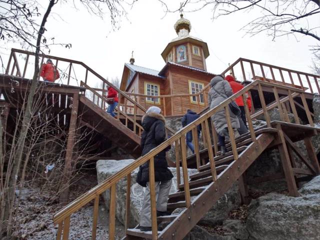 По легенде, в древности на этом месте стоял монастырь. Когда татары обложили его, и защитников святыни стала мучить жажда, им явился образ Божьей Матери, и на этом месте из земли забил целебный источник. Рядом с источником находится пещера монаха-отшельника с целебной глиной, над которой сооружена деревянная церковь Иконы Божьей Матери.