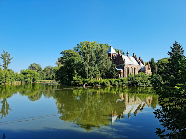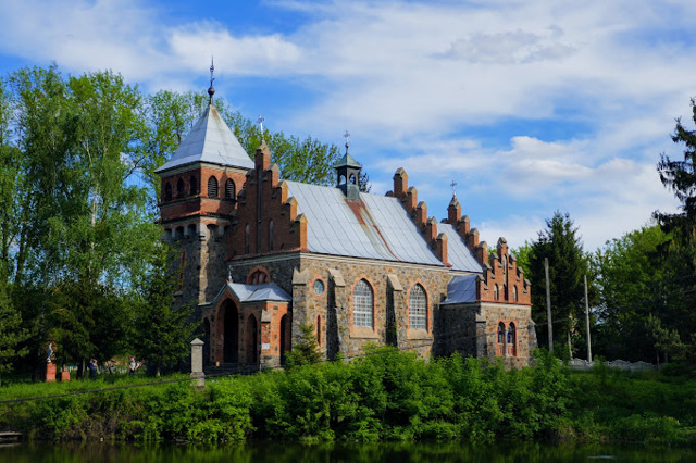 Неоготический костел Святой Клары, расположенный на берегу маленького пруда в Городковке, издалека можно принять за средневековый замок.