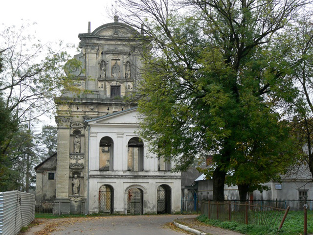 Фасад украшен многочисленными скульптурами святителей и сложной белокаменной резьбой (предполагают, что в строительстве участвовал мастер, оформлявший фасад костела иезуитов во Львове). Оборонный характер сооружения выдают ключевидные бойницы, расположенные по периметру вдоль карниза.