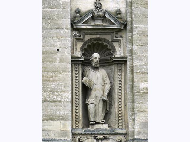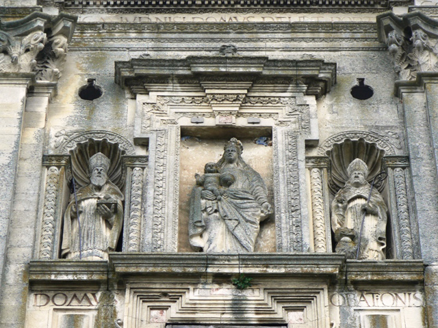 Фасад прикрашений численними скульптурами святителів та складним білокам'яним різьбленням (припускають, що у будівництві брав участь майстер, який оформляв фа ...