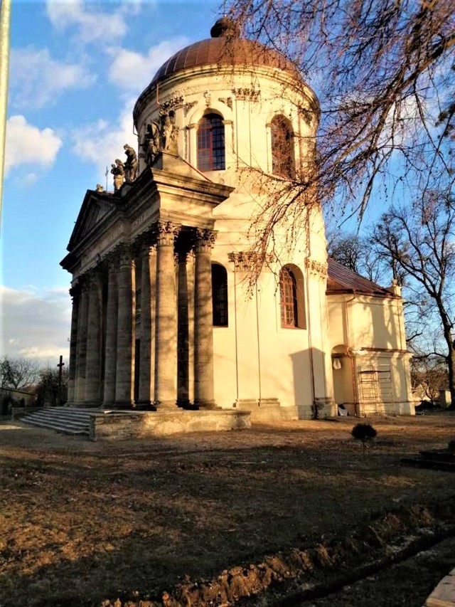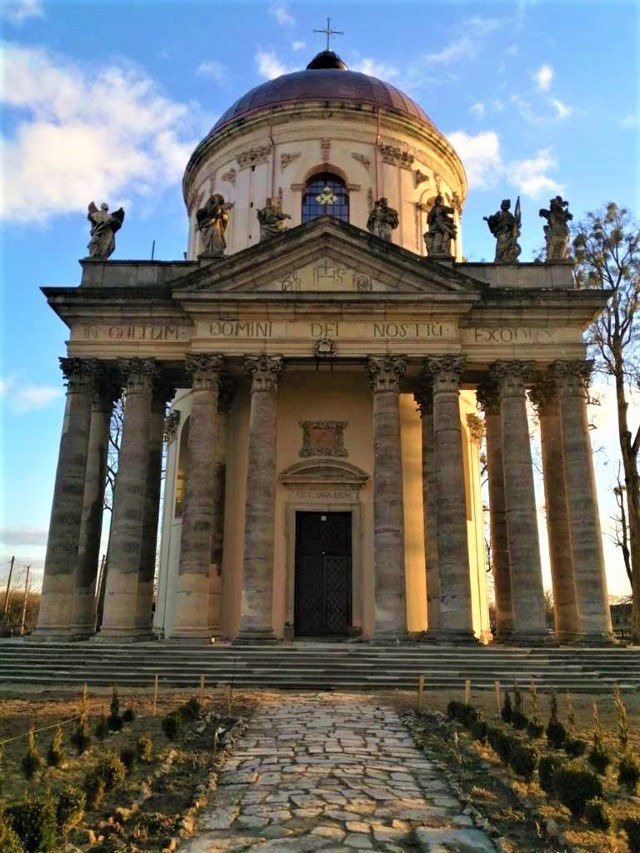 Выполнен в стиле барокко в виде ротонды, к которой от Подгорецкого замка ведет 300-метровая липовая аллея. Перед храмом установлены фигуры Богоматери и Святого Иосифа на колоннах. Главный фасад украшает портик из 14 колонн коринфского ордера, на аттике которого было установлено 8 скульптур святых работы Фессингера и Лебласа (одна из них уничтожена во время Второй мировой войны).