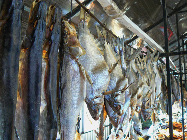 На градижском рынке продают свежую, сушеную, вяленную и копченую днепровскую рыбу: судак, лещ, сом, щука и другая.