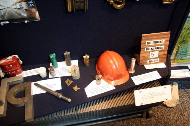 Экспозицию открывает панорамное фото станции метро "Металлургов" со схемой всей линии и перспективных участков. В экспозиции представлены документы и фотографии, иллюстрирующие историю строительства объекта и нынешнюю повседневную работу метро. Можно увидеть образцы пород, через которые вели проходку метростроители, образцы строительных конструкций и технологического оборудования, символические ключи от каждой станции первой очереди и всего метрополитена, образец типичного станционного светильника.