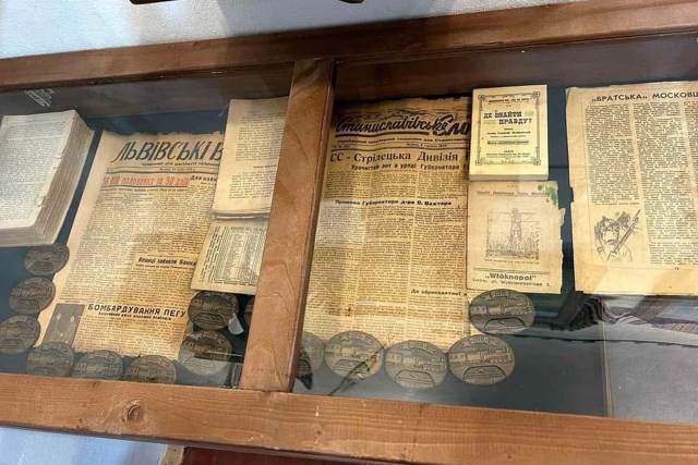 Також представлена зброя часів Першої світової війни, старі газети, грошові банкноти, картини на залізничну тематику та світлини.