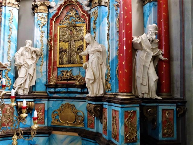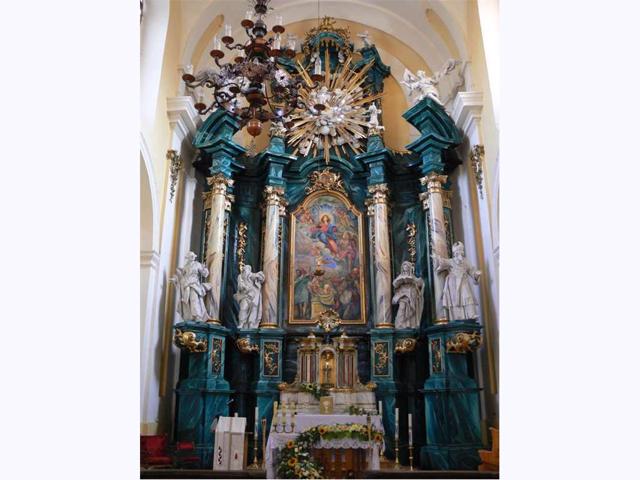 Над внутренним оформлением Успенского костела несколько лет работал выдающийся скульптор Иван Пинзель. Монументальная композиция из пяти алтарей включает образ Матери Божьей с Младенцем Иисусом, фигуры Святого Иоанна Евангелиста, Святого Иоахима, Святой Анны,Святого Зазария, Архангела Михаила, ...