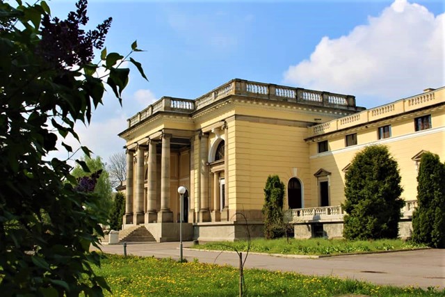Парковий фасад палацу охороняють дві скульптури сонних левів. Від старих садибних споруд залишилася ...