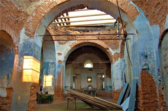 Согласно церковным записям, храм перенесли на место нового поселения из села Куриловка. В 1812 году церковь Рождества Богородицы была отстроена в камне. Храм трехчастный, с прямоугольной в плане центральной частью, полукруглой апсидой и выступающим притвором. На западном фасаде - четырехколонный портик, завершенный треугольным фронтоном.