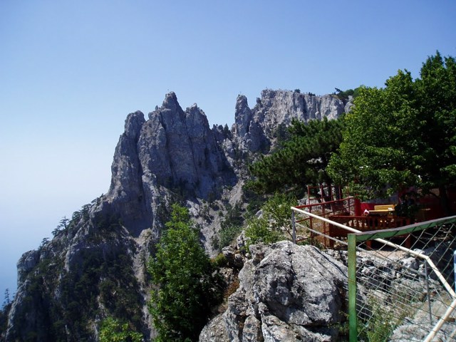 Возвышается над Алупкой и Кореизом. Белые зубцы, формирующие неповторимый силуэт горы Ай-Петри, состоят из четырех крупных (высотой 12-15 метров) и ряда мелких отвесных пиков, образовавшихся при выветривании неоднородных рифовых известняков.