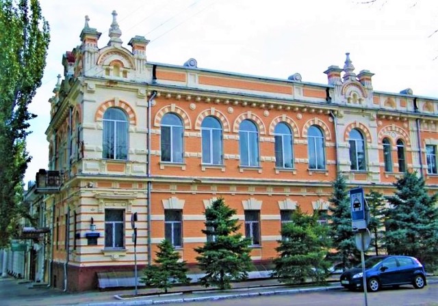 Еклектична будівля, облицьована цеглою, багато декорована в романському та мавританському стилі. З 1911 року тут розміщувалося Херсонське відділення Санкт-Петербурзького міжнародного комерційного банку.