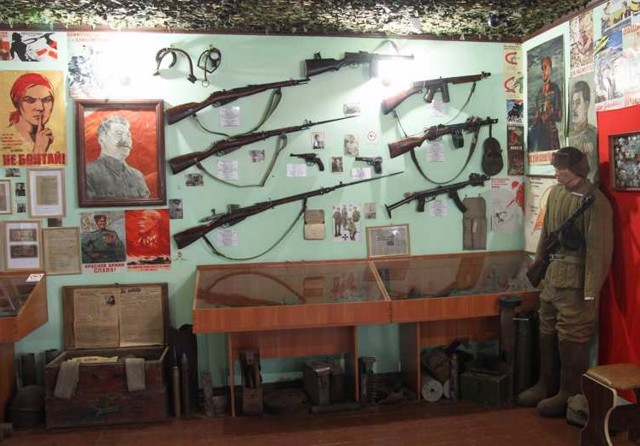 Также представлено разнообразное стрелковое оружие (пулеметы MG-34, "Максим", КПВТ, ПТК; пистолеты-пулеметы "Томпсон", МР-38, ППШ, ППС, автоматы АК-47 и их модификации, винтовки, пистолеты и другое) и военная форма разных времен.