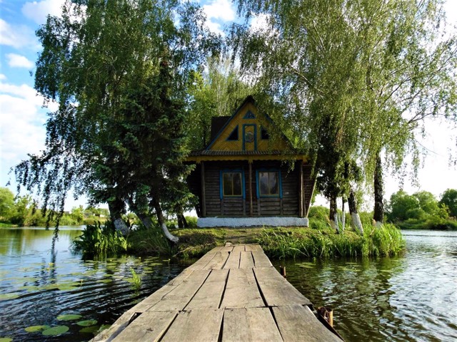 Романтичний будиночок з хитким місточком на маленькому острові в оточенні ялин і беріз виглядає дуже колоритно в будь-яку пору року, чим приваблює туристів та фотографів.