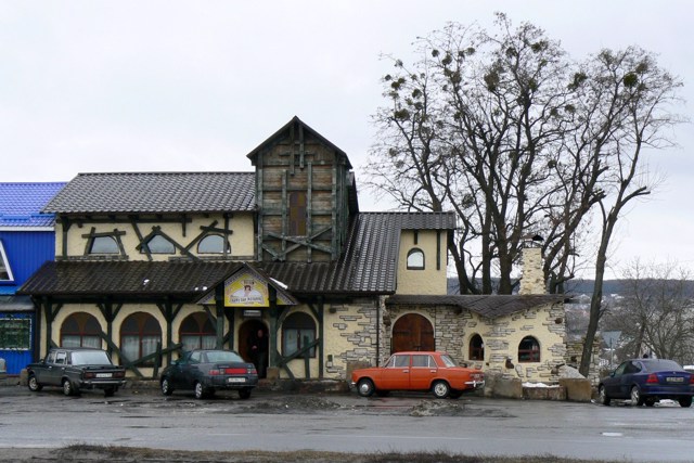Мальовничо розташована на схилі пагорба над ставком.